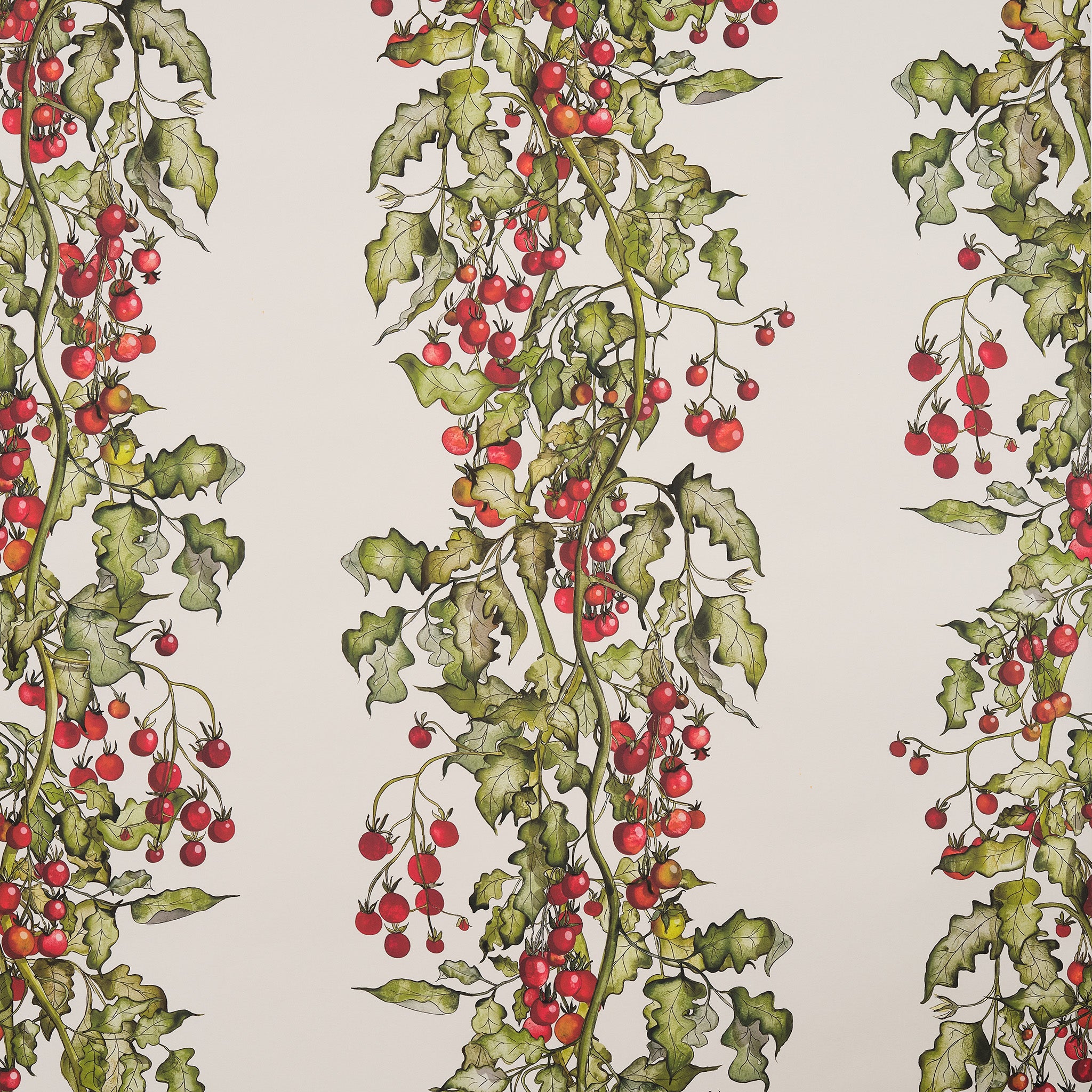 Inspired by our kitchen gardens at Thyme and designed in combination with our other Kitchen Garden Prints, our Founder, Caryn hand painted gorgeous vines of tomatoes and translated them into a wonderful interiors collection of fabrics and wallpapers.